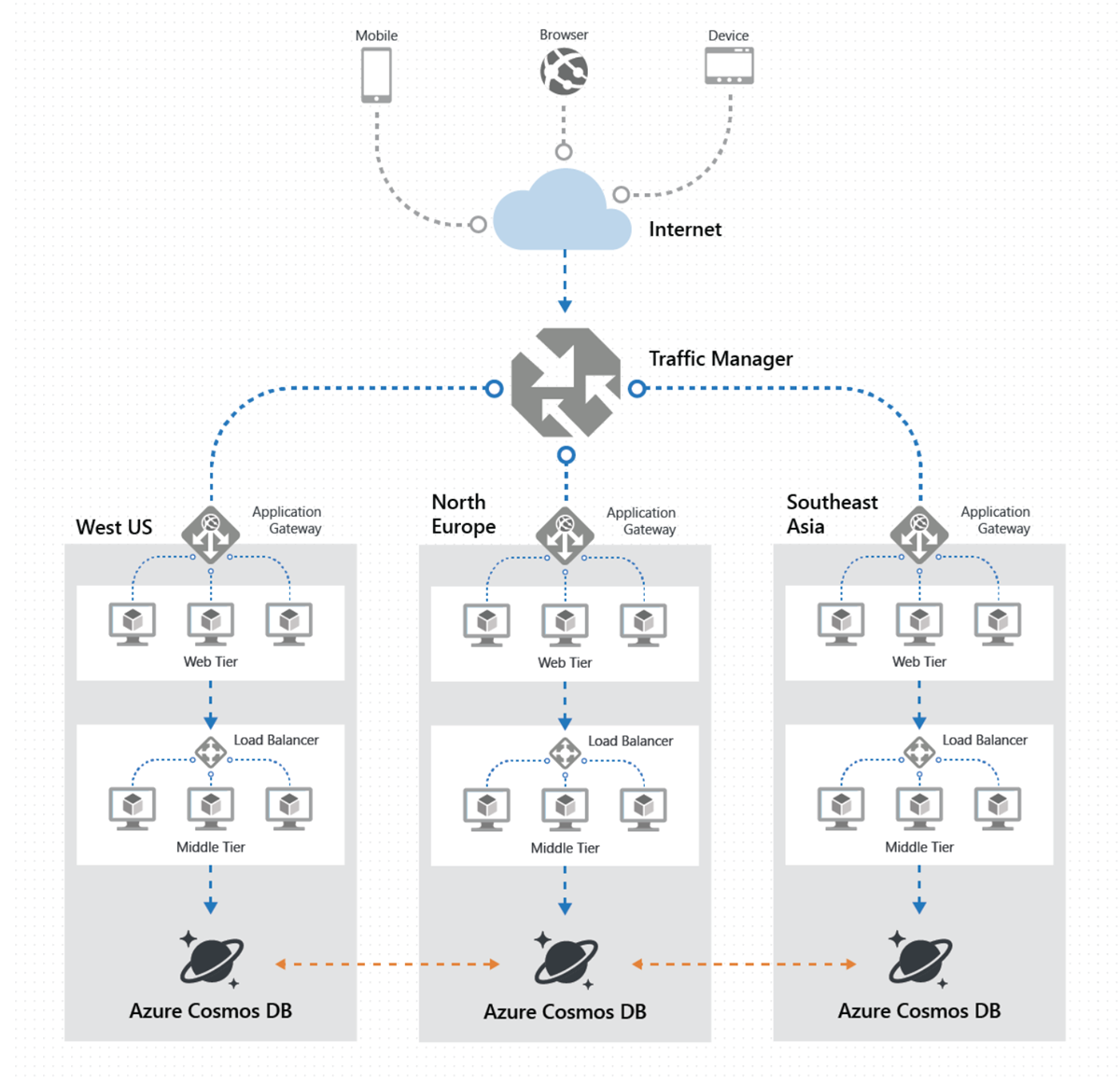 As you add and remove regions to and from your Azure Cosmos DB account, your application doesn't need to be redeployed or paused, it continues to be highly available at all times.