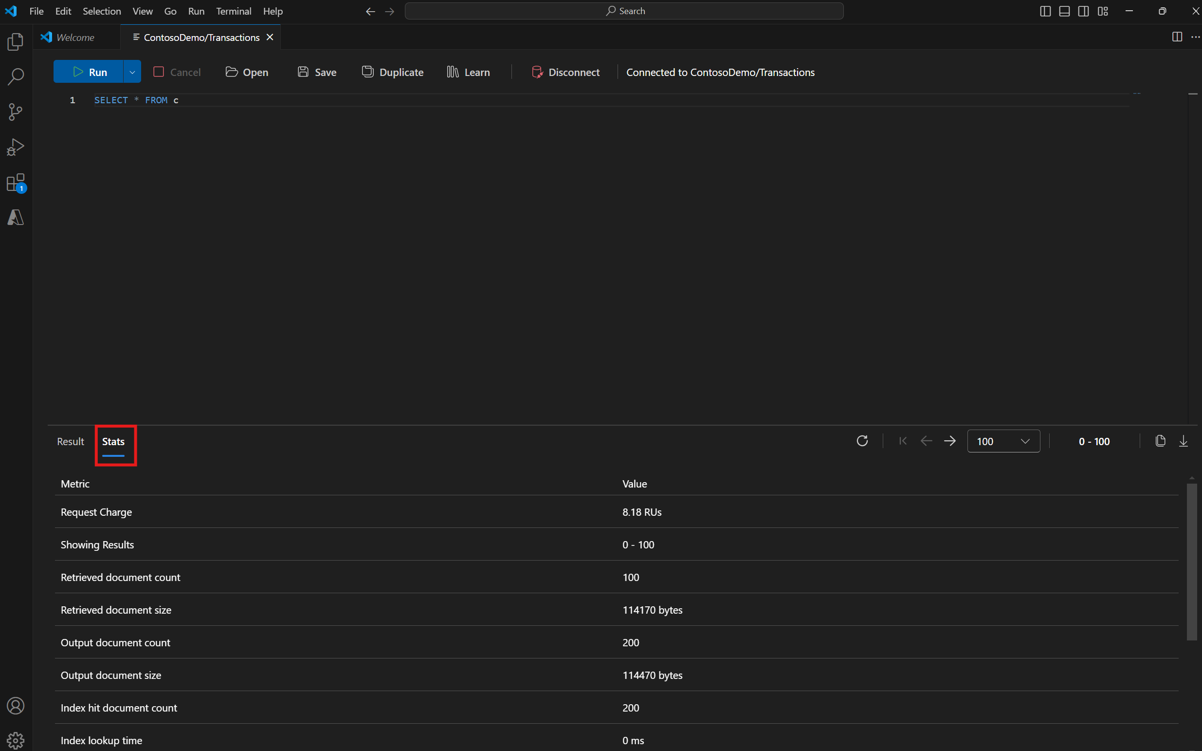 Within the query editor, view more query and index metrics to better help optimize your query performance.