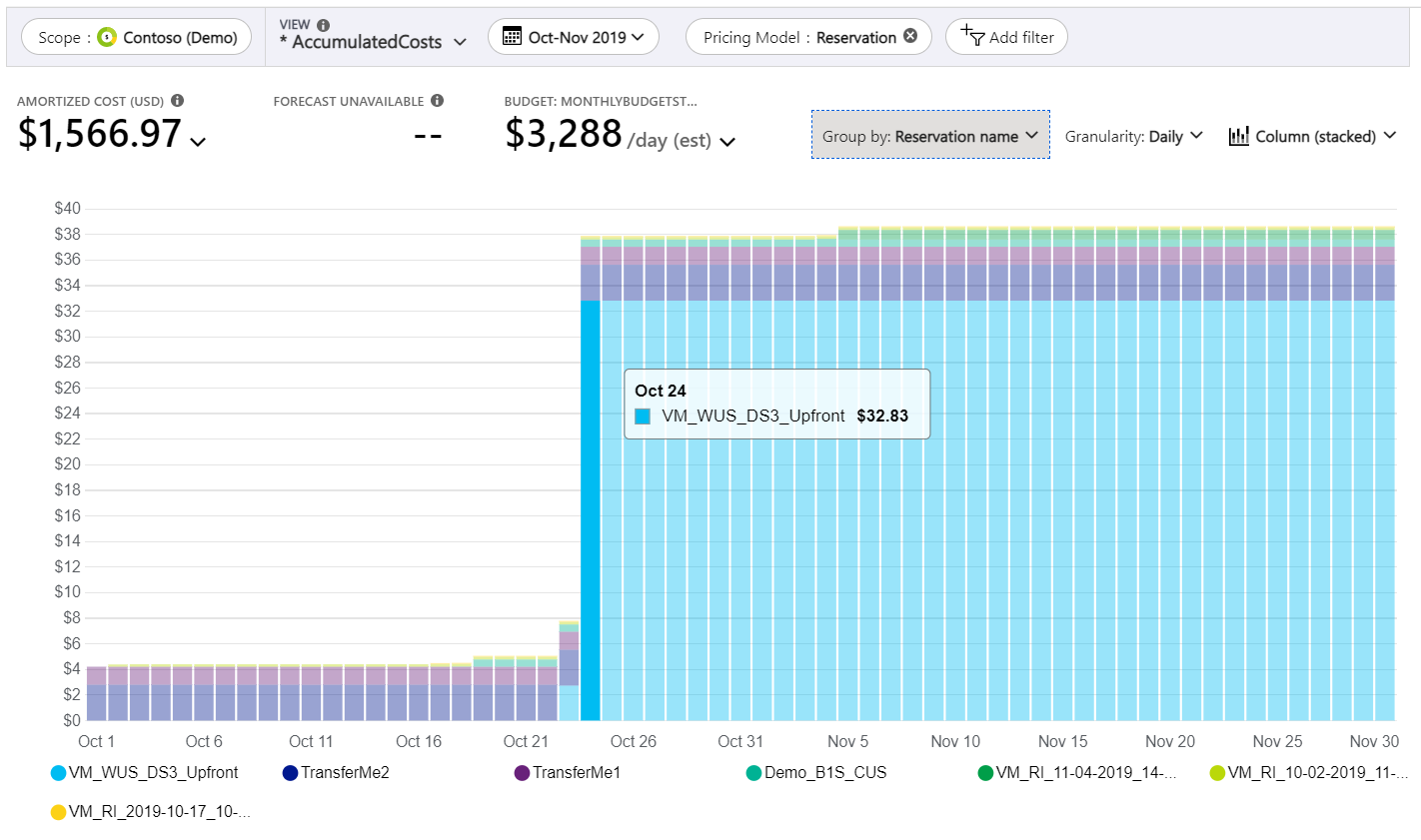 - If you have multiple reservations (the previous example does), then use the Group by list to group the results by Reservation name. Here's an example showing the daily amortized cost of the reservation named