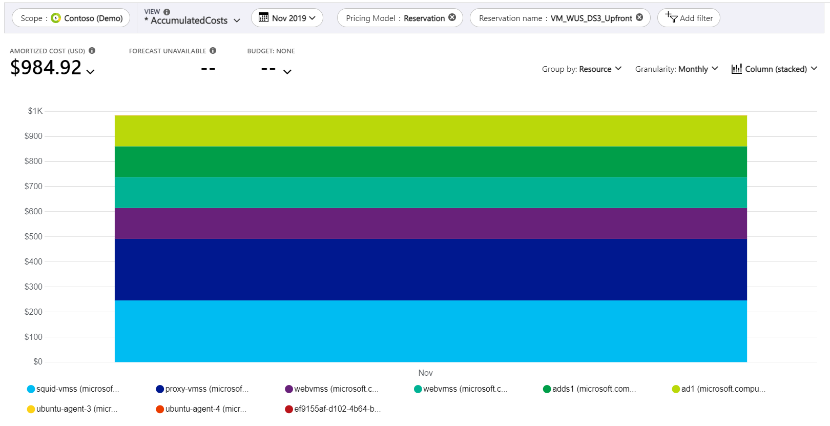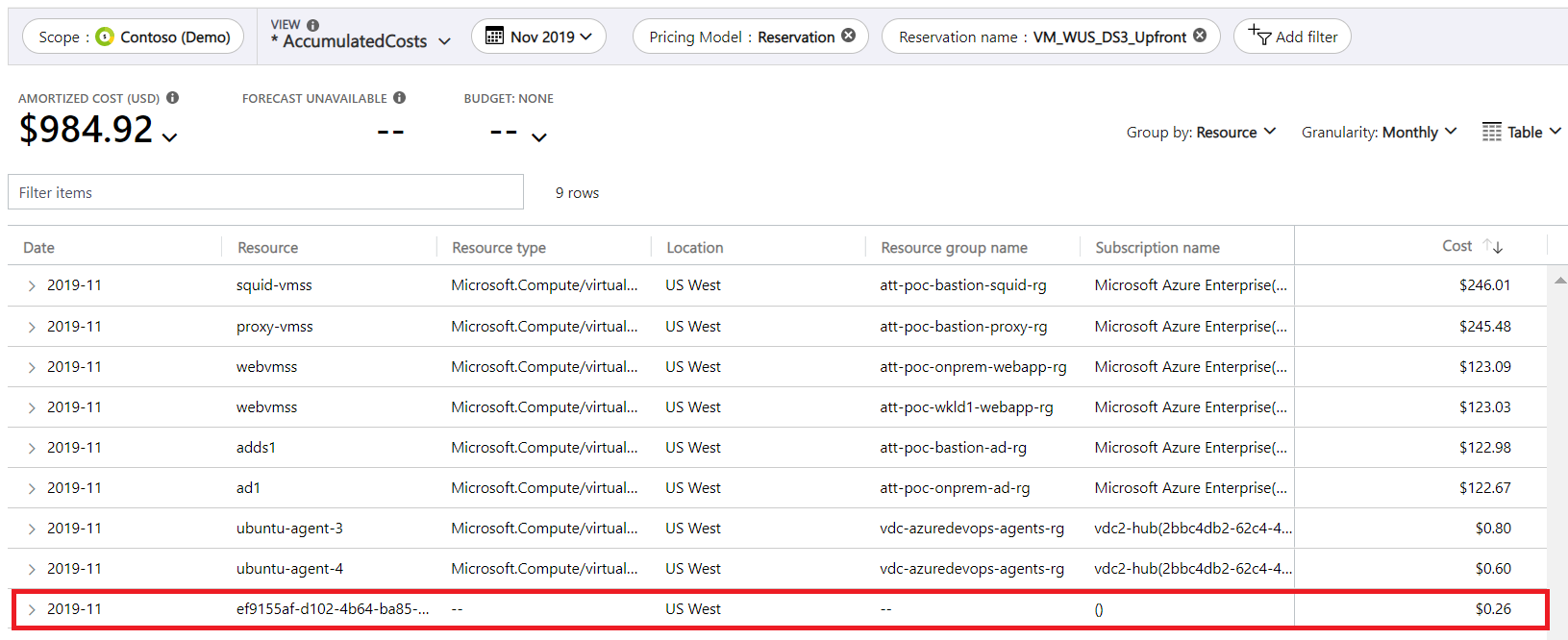 - To see the cost more easily for individual resources, select Table in the chart list. Expand items as needed. Here's an example for November 2019 showing the amortized reservation costs for the eight resources that used the reservation. The highlighted cost is the unused portion of the reservation.