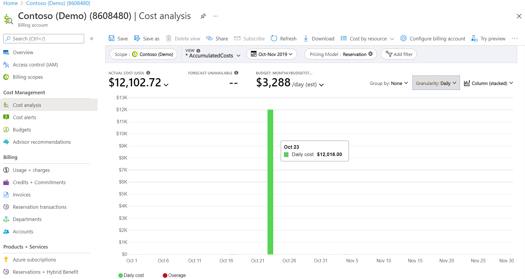- Next, change the Granularity to Monthly and expand the date range. The following example shows varying monthly costs for reservations. The cost varies because the number of days in each month differs. November has 30 days, so the daily cost of $32.83 * 30 = ~$984.90.