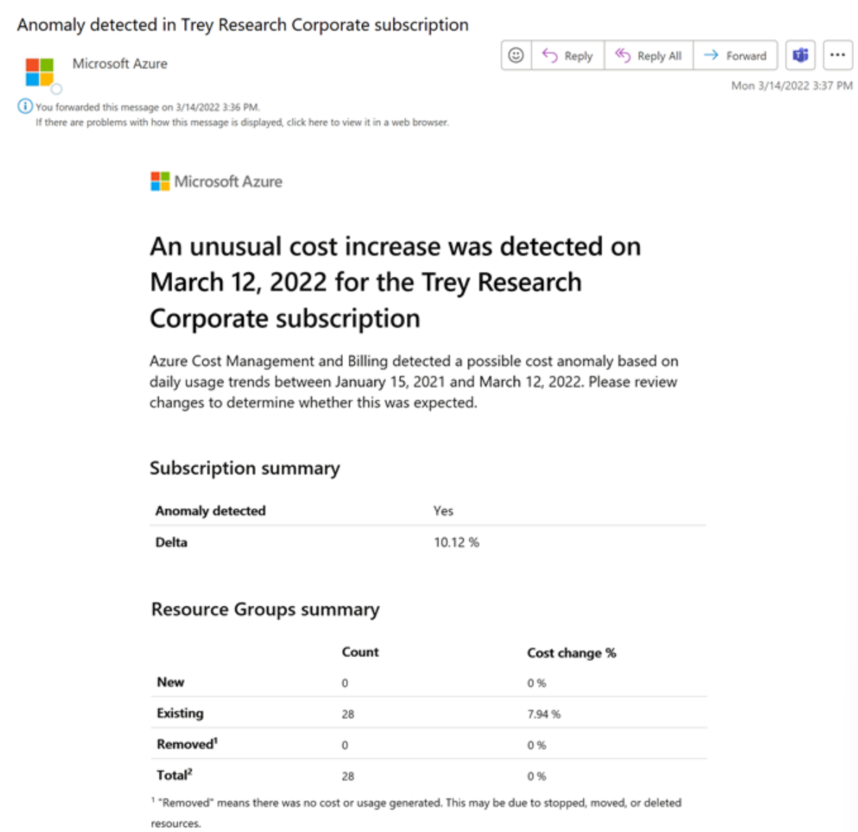 An anomaly alert email includes a summary of changes in resource group count and cost. It also includes the top resource group changes for the day compared to the previous 60 days. And, it has a direct link to the Azure portal so that you can review the cost and investigate further.