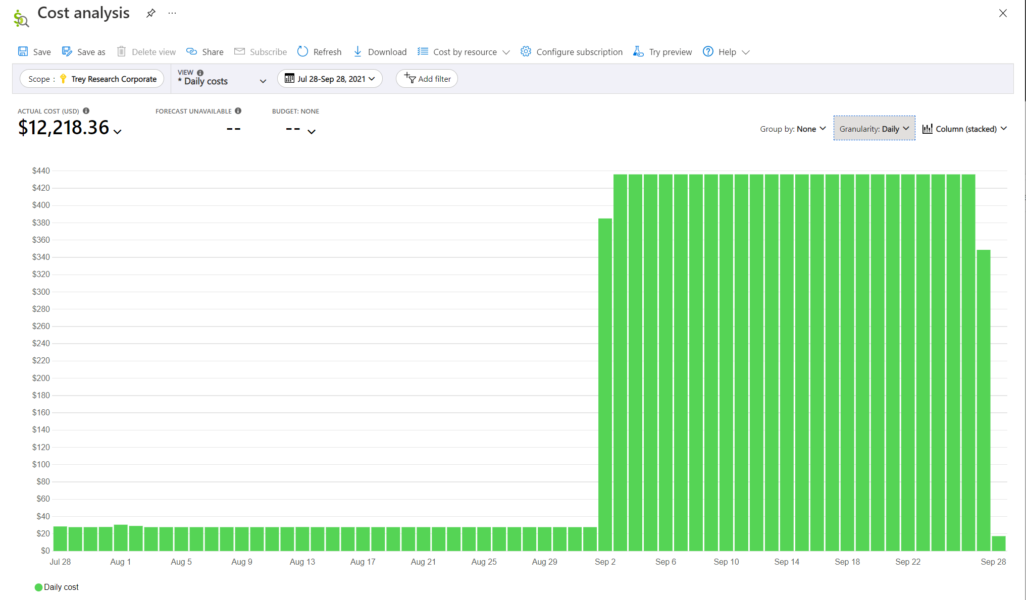 Let's look at a more detailed example of finding a change in cost. When you navigate to Cost Analysis and then select a subscription scope, you start with the Accumulated costs view. The following screenshot shows an example of what you might see.