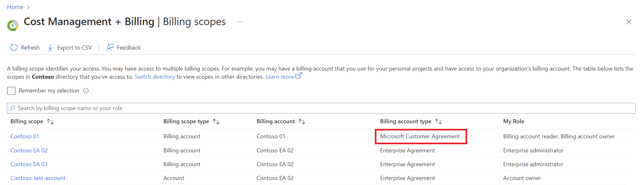 If you have access to multiple billing scopes, check the type in the Billing account type column. You have access to a billing account for a Microsoft Customer Agreement if the billing account type for any of the scopes is Microsoft Customer Agreement.