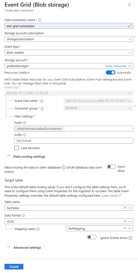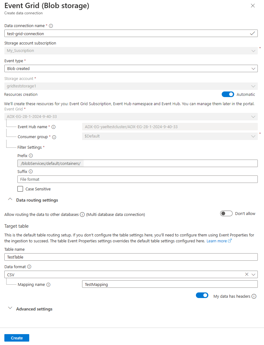 Setting Suggested value Field description Data connection name test-grid-connection The name of the connection that you want to create in Azure Data Explorer. Data connection names can contain only alphanumeric, dash and dot characters, and be up to 40 characters in length. Storage account subscription Your subscription ID The subscription ID where your storage account is. Event type Blob created or Blob renamed The type of event that triggers ingestion. Blob renamed is supported only for ADLSv2 storage. To rename a blob, navigate to the blob in Azure portal, right-click on the blob and select Rename. Supported types are: Microsoft.Storage.BlobCreated or Microsoft.Storage.BlobRenamed. Storage account gridteststorage1 The name of the storage account that you created previously. Resources creation Automatic Turning on automatic resource creation means that Azure Data Explorer creates an Event Grid Subscription, an Event Hubs namespace, and an Event Hubs for you. Otherwise, you need to create these resources manually to ensure the creation of the data connection. See Manually create resources for Event Grid ingestion Optionally, you can track specific Event Grid subjects. Set the filters for the notifications as follows: