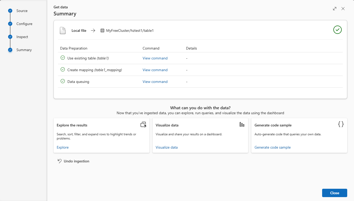 In the Data preparation window, all three steps show green check marks when data ingestion finishes successfully. You can view the commands that each step used, or select a card to query, visualize, or drop the ingested data.