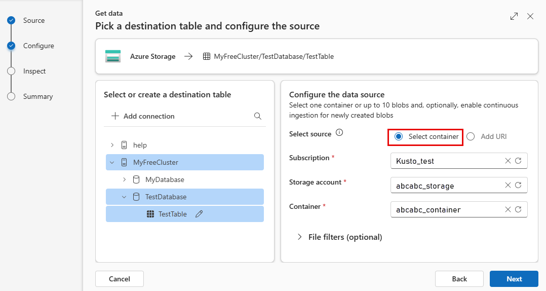 To add your source, select Select container or Add URI.
