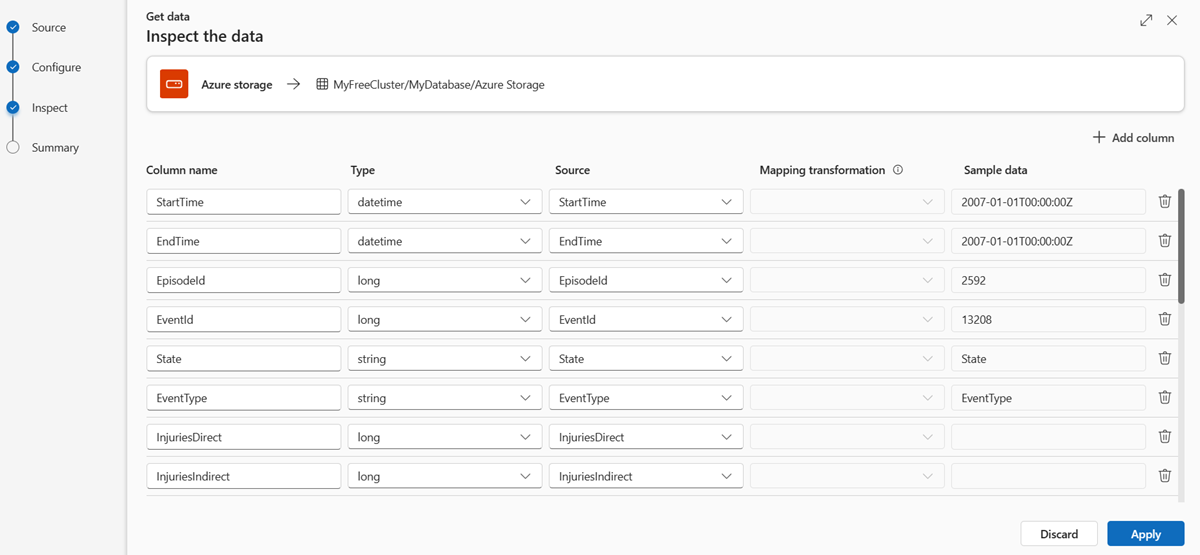 If you're ingesting tabular formats in an existing table, you can select the table mapping drop-down and select Use exixting mapping. Tabular data doesn't necessarily include the column names that are used to map source data to the existing columns. When this option is checked, mapping is done by-order, and the table schema remains the same.