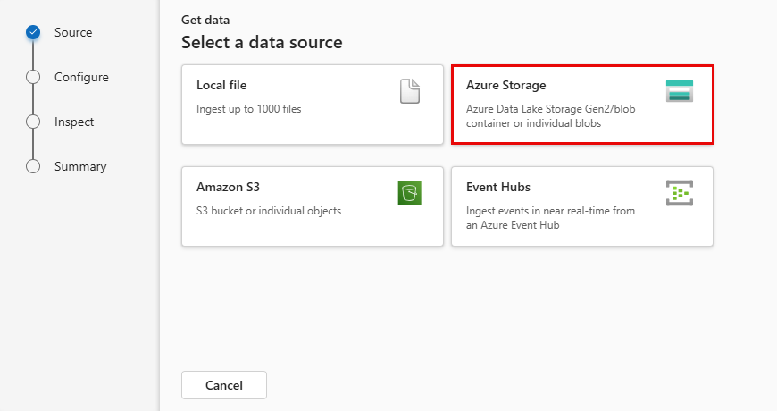 Select the data source from the available list. In this example, you're ingesting data from Azure storage.