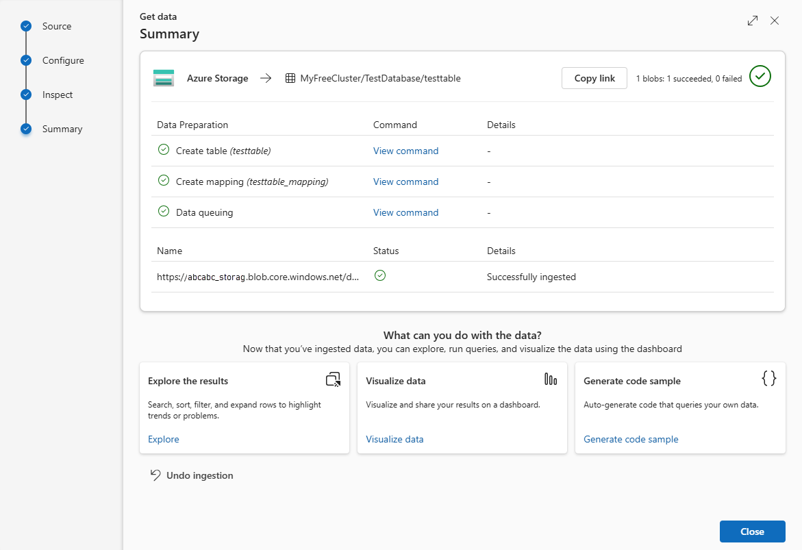In the Summary window, all three steps are marked with green check marks when data ingestion finishes successfully. You can view the commands that were used for each step, or select a card to query, visualize, or drop the ingested data.