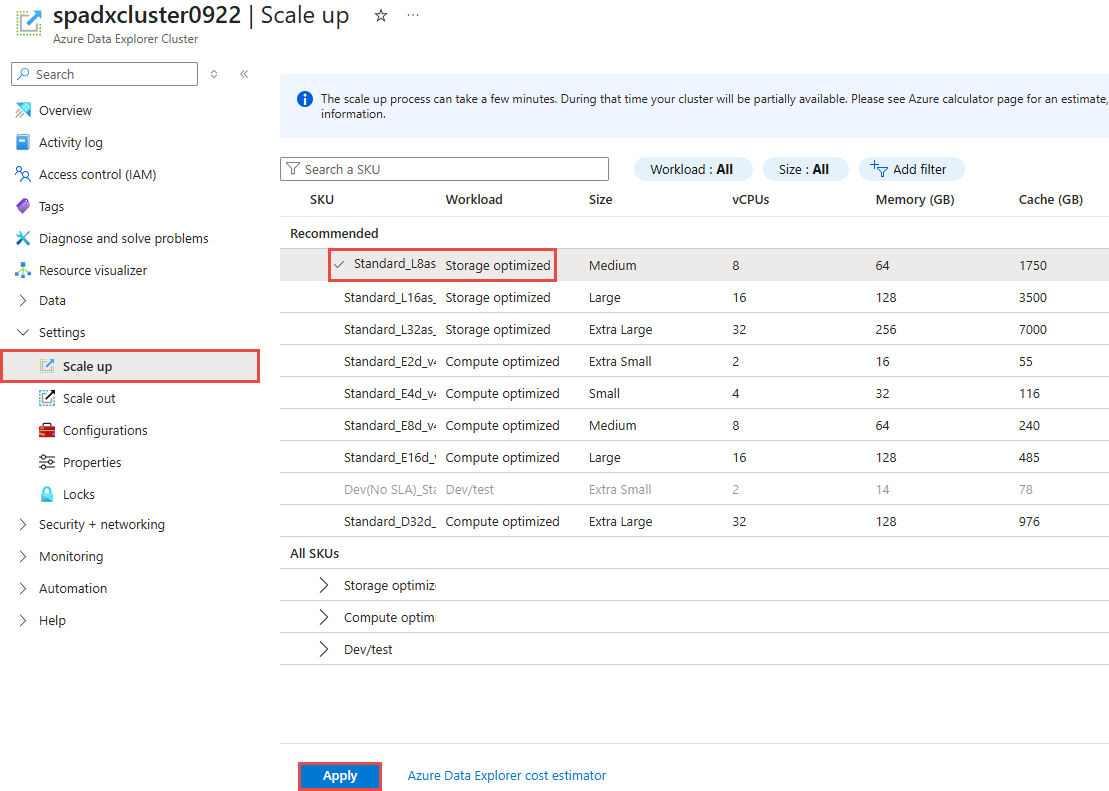 In the Scale up window, you see available (Stock Keeping Unit) SKUs for your cluster. For example, in the following figure, there are eight recommended SKUs available. Expand the Storage optimized, Compute optimized, and Dev/test dropdowns to see more options.