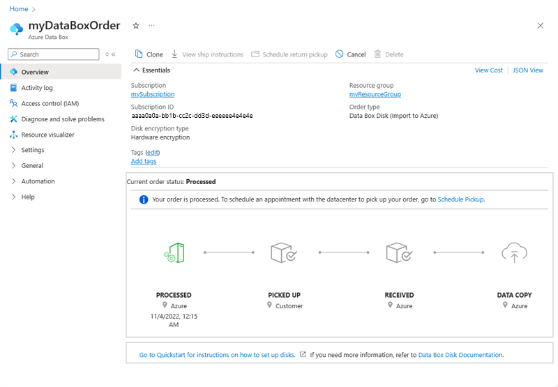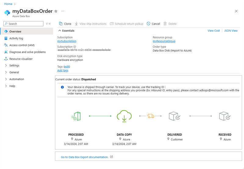 After you place the order, you can track the status of the order from Azure portal. Go to your Data Box order and then go to Overview to view the status. The portal shows the order in Ordered state.