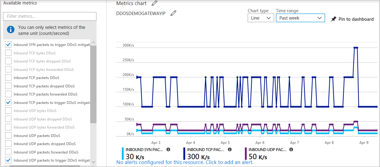 We recommend configuring an alert on this metric. You'll then be notified when there’s an active DDoS mitigation performed on your public IP address.