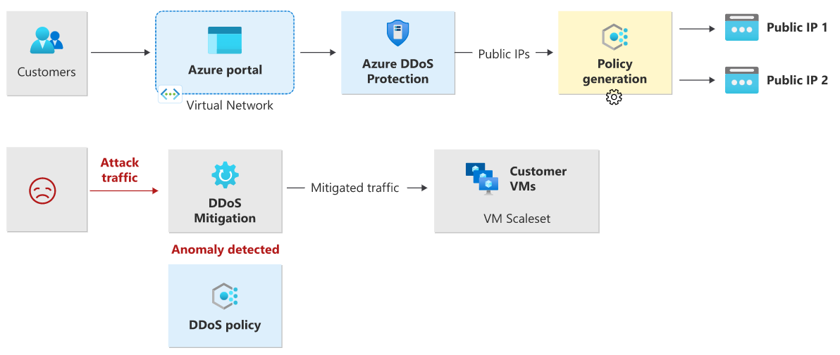 Azure DDoS Protection monitors actual traffic utilization and constantly compares it against the thresholds defined in the DDoS Policy. When the traffic threshold is exceeded, DDoS mitigation is initiated automatically. When traffic returns below the thresholds, the mitigation is stopped.