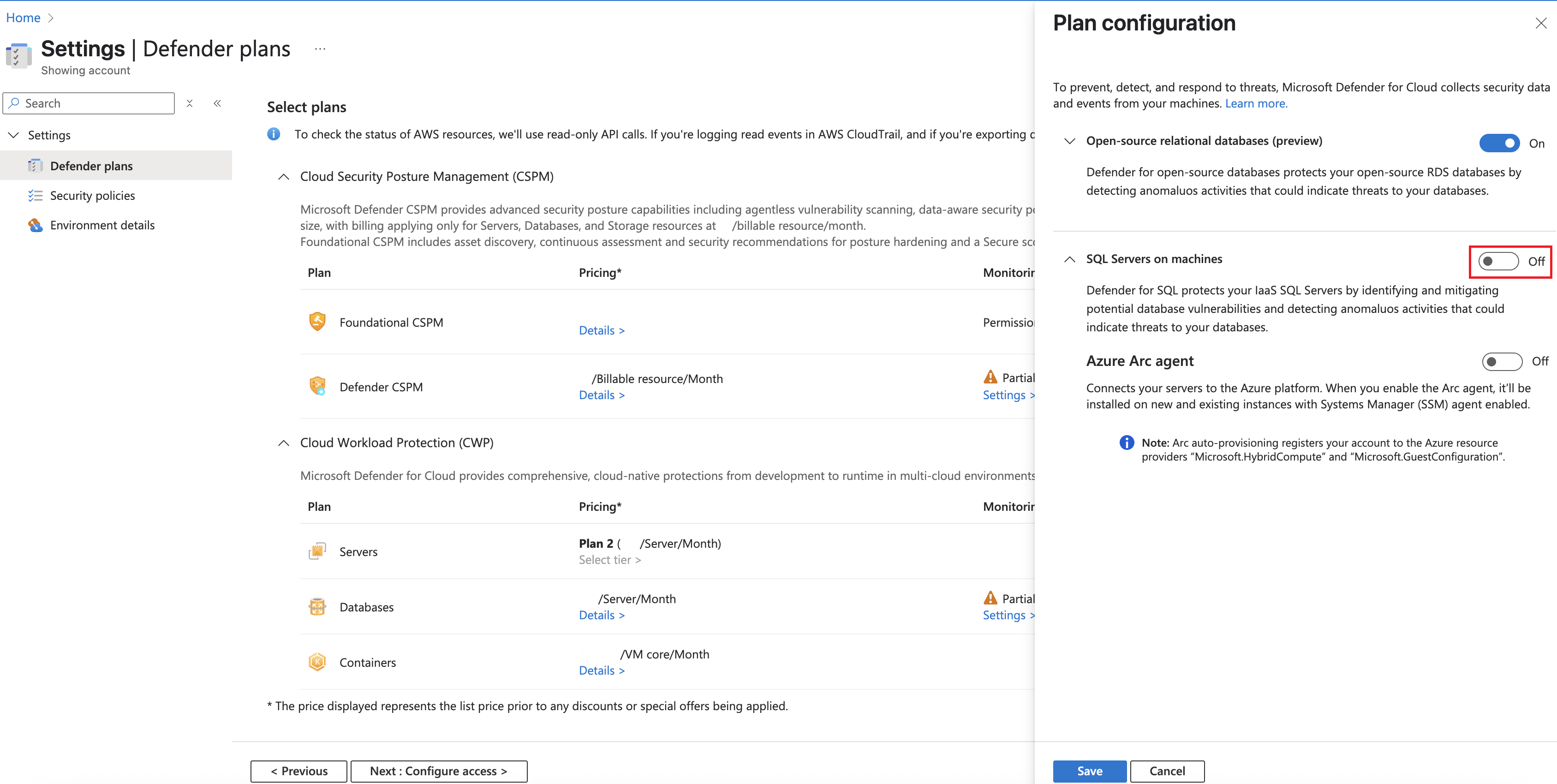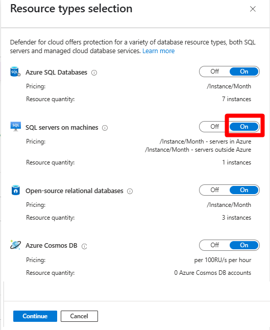 In the Resource types selection window, toggle the SQL Servers on Machines plan to On.