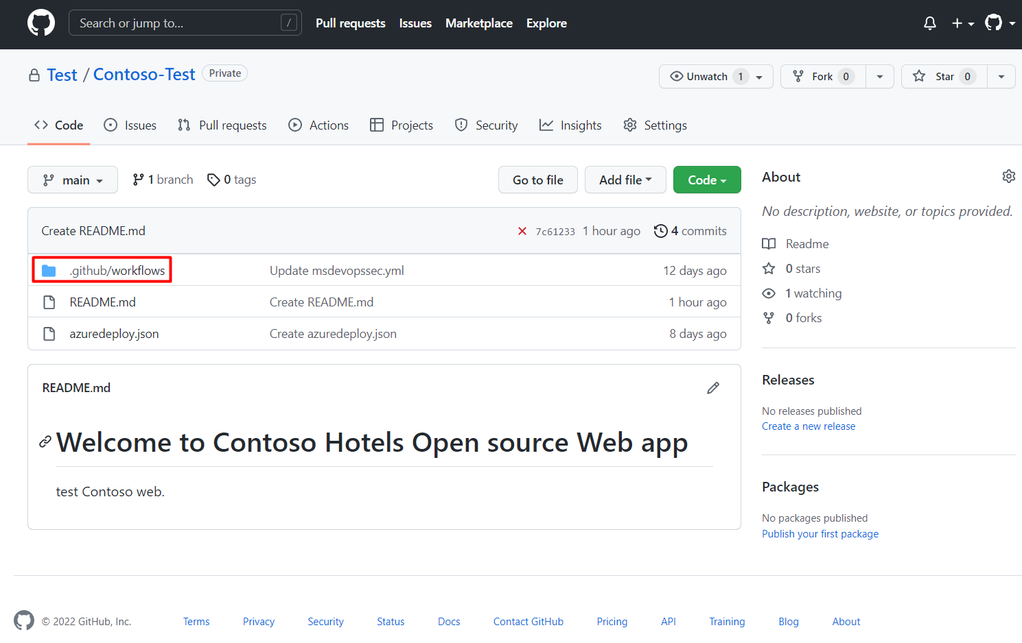Your repository's home page> .github/workflows.Select msdevopssec.yml, which was created in the prerequisites.