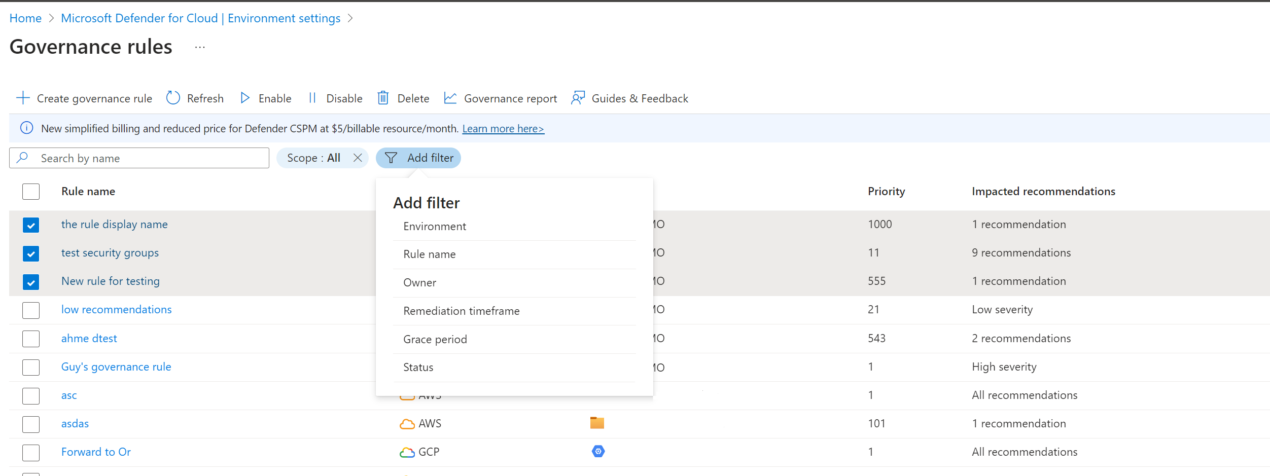 - Filter on Environment to identify rules for Azure, AWS, and GCP.