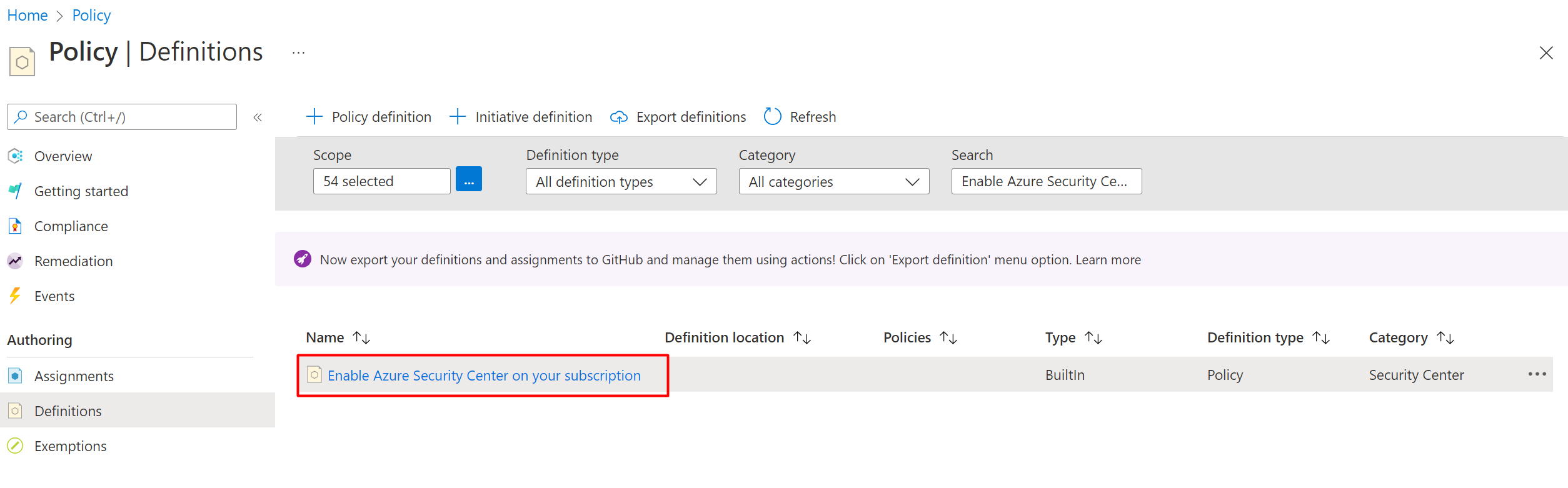As a user with Security Admin permissions, open Azure Policy and search for the definition