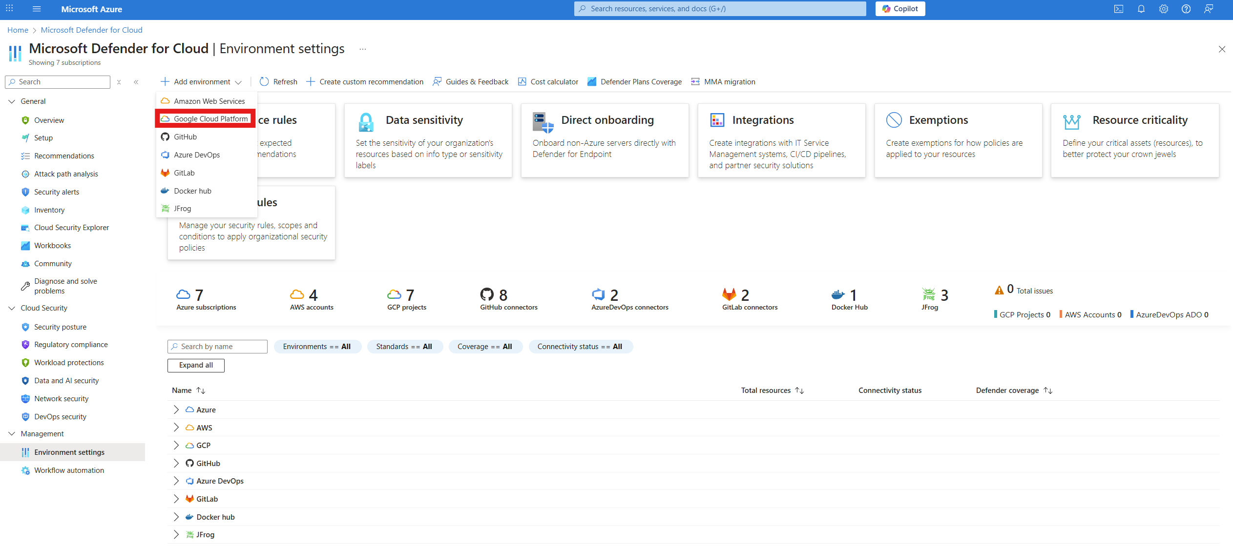 - GCP projects are connected to Microsoft Defender for Cloud at the project level.