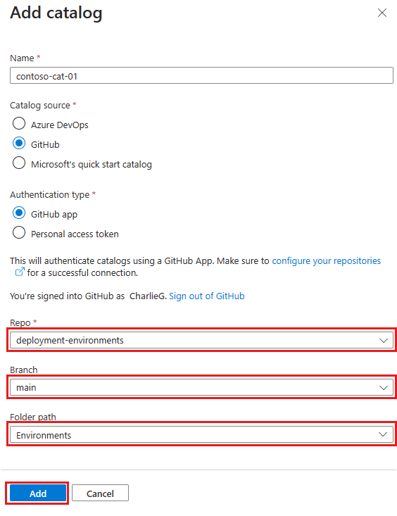 In Add catalog, enter the following information, and then select Add: