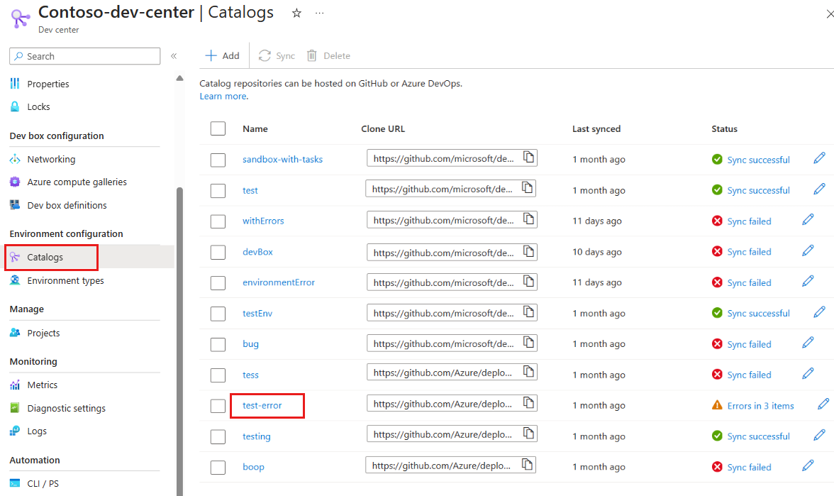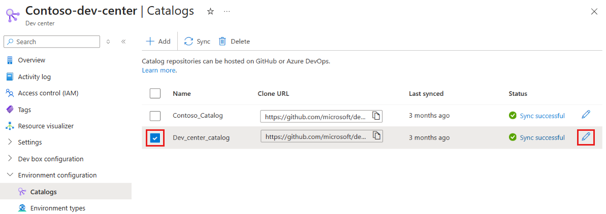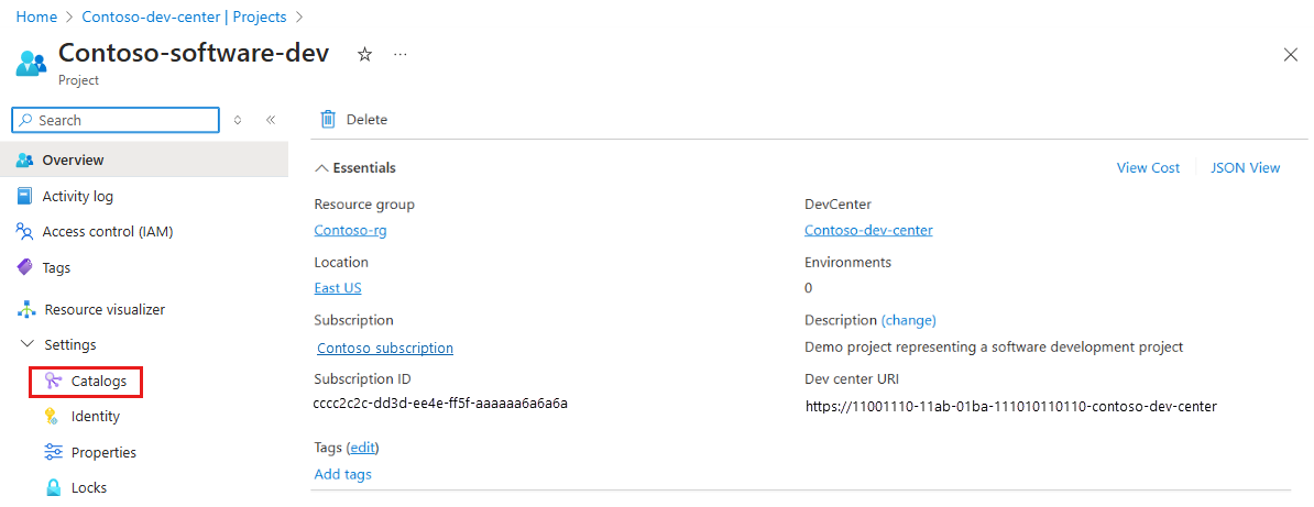 On the left menu for your dev center or project, under Environment configuration, select Catalogs.
