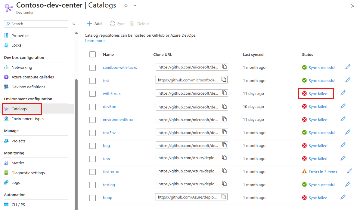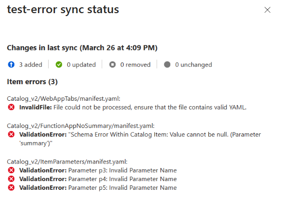 When you add or sync a catalog, you might encounter a sync error or warning. A sync error indicates that a catalog failed to sync successfully, A sync warning indicates that some or all of the catalog items have errors. You can view the sync status and errors in the Azure portal, or use the Azure CLI and REST API to troubleshoot and resolve the errors.
