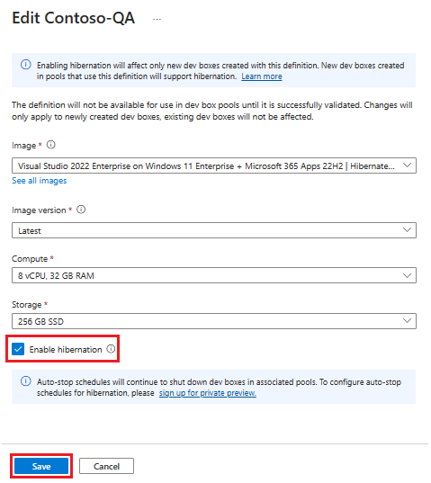 On the Edit dev box definition page, select the Enable hibernation checkbox.