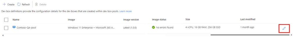 Select the dev box definition that you want to update, and then select the edit (pencil) button.
