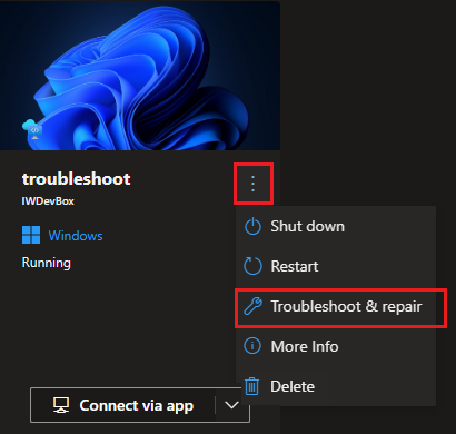 If your dev box is running and you still can't connect to it with RDP, on the more actions (...) menu, select Troubleshoot & repair.