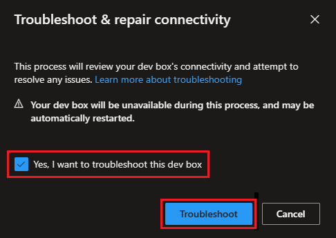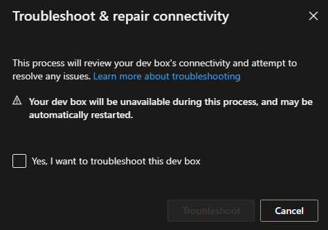 In the Troubleshoot & repair connectivity message box, select Yes, I want to troubleshoot this dev box, and then select Troubleshoot.