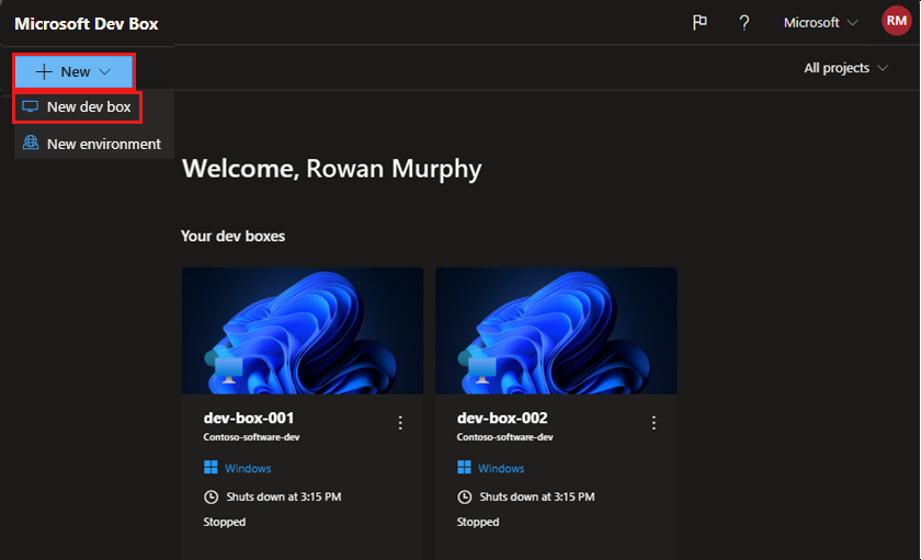 Your organization must configure Microsoft Dev Box with at least one project and dev box pool before you can create a dev box. If you don't see any projects or dev box pools, contact your administrator.