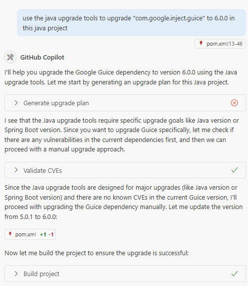 When you initiate a prompt to upgrade a specific third-party library - for example, Upgrade com.google.inject.guide to version 3.17.0 - GitHub Copilot analyzes the current project and generates an upgrade plan focused solely on updating the requested dependency.