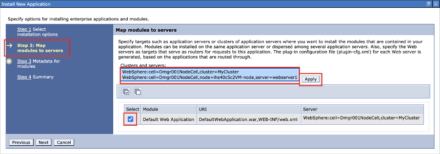 In the Fast Path wizard, use the defaults for everything except Step 2: Map modules to servers. On that page, select the checkbox for the Default Web Application Module row, then hold Ctrl and select the options under Clusters and servers. Finally, select Apply.