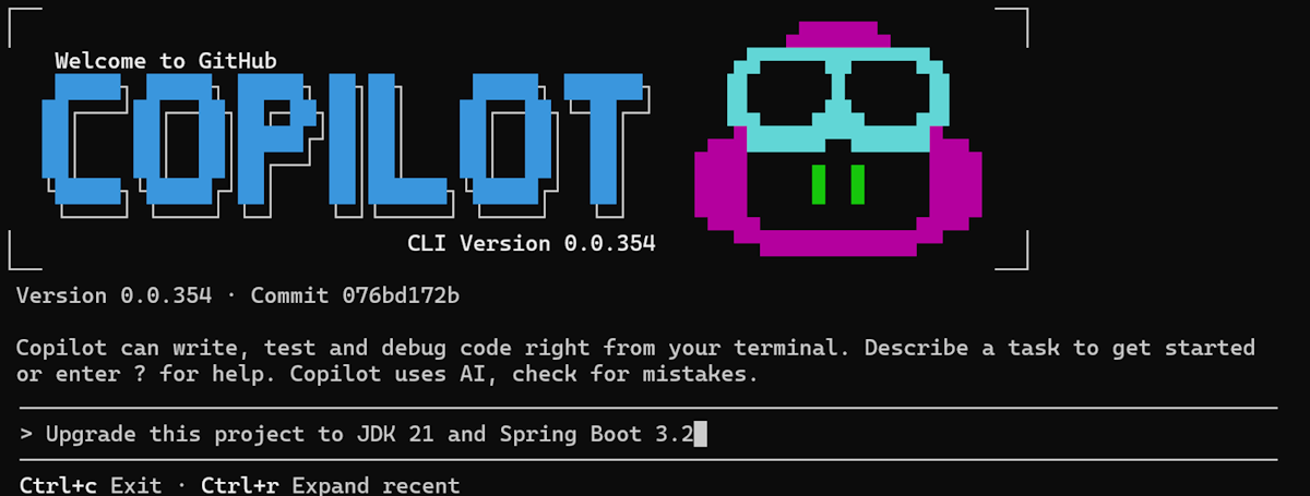 To upgrade your Java application to a newer runtime or framework version, run the following example prompt in Copilot CLI. This approach helps ensure your project stays aligned with the latest platform capabilities and security updates.