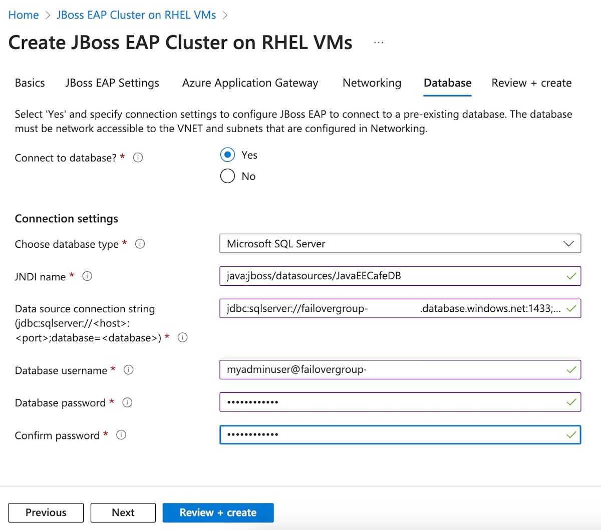 jdbc:sqlserver://failovergroup-gzh032124.database.windows.net:1433;database=mySampleDatabase. - For Database username, enter the server admin sign-in name and the failover group name you wrote down from the preceding section - for example,