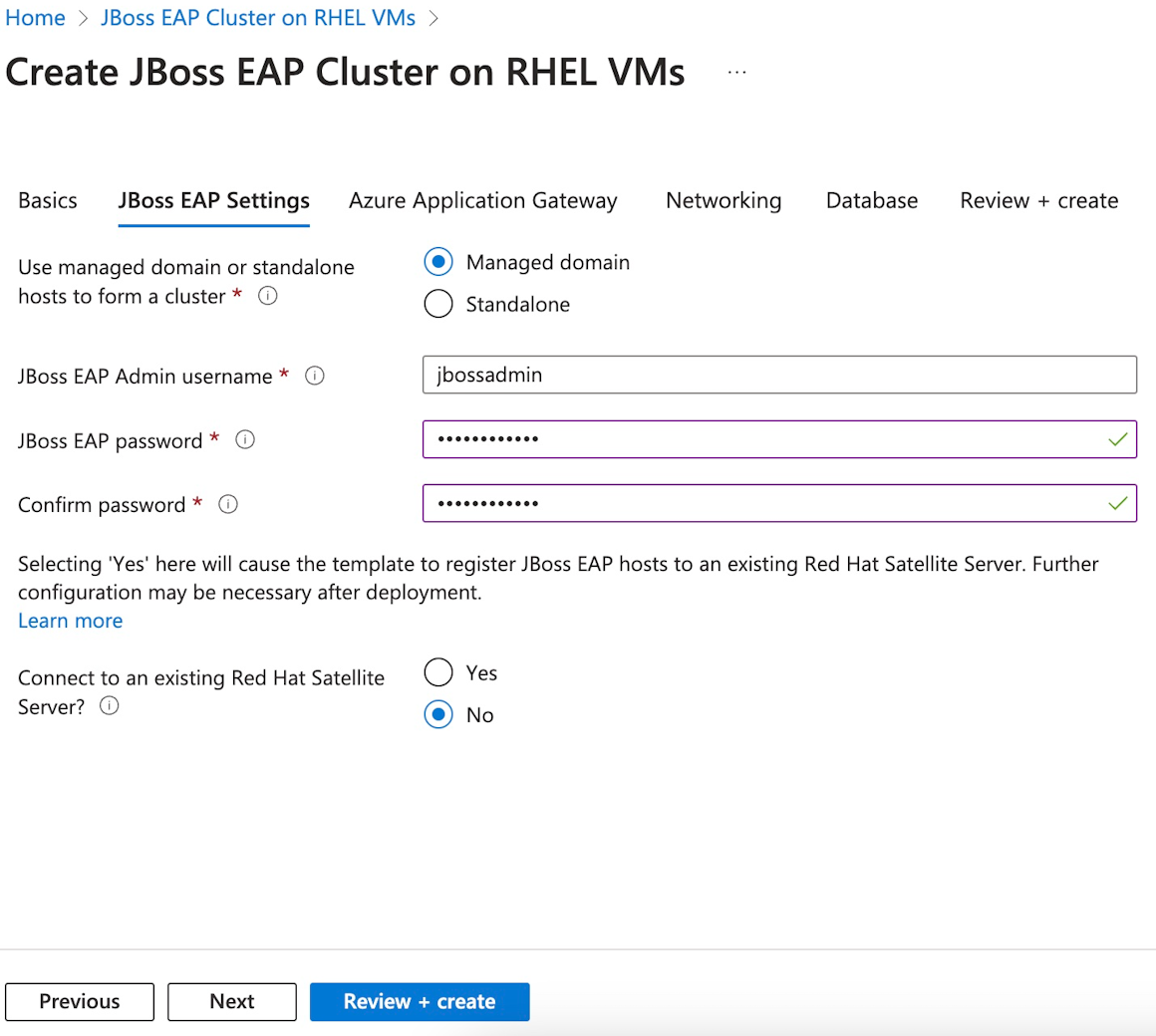 - Provide a JBoss EAP password for JBoss EAP password. Use the same value for Confirm password. Write down the value for later use.