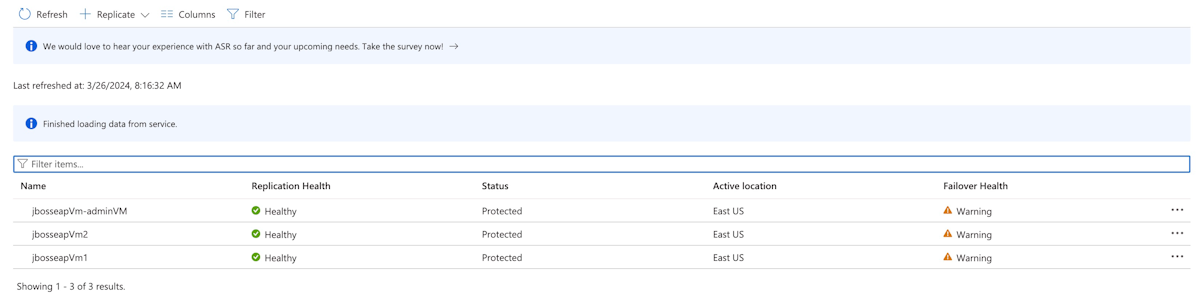 You might notice that Azure Site Recovery supports reprotecting VMs when the target VM exists. For more information, see the Reprotect the VM section of Tutorial: Fail over Azure VMs to a secondary region. However, it doesn't work when the only changes between the source disk and the target disk are synchronized for the JBoss EAP cluster, based on the verification result. This tutorial establishes a new replication from the secondary site to the primary site after failover, in which the entire disks are copied from the failed over region to the primary region. For more information, see the section What happens during reprotection? in Reprotect failed over Azure virtual machines to the primary region.