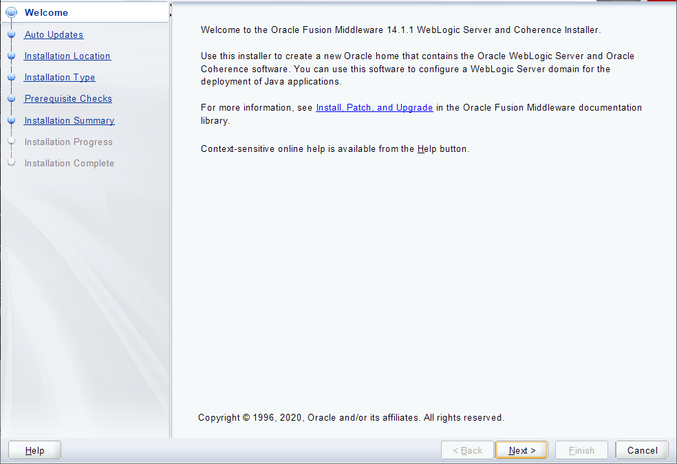 The following sections describe the steps for installing WebLogic Server on either GNU/Linux or Windows Server. You can choose the operating system, JDK version, and WebLogic version according to your requirements, but you should verify that they're available in Oracle Fusion Middleware Supported System Configurations. Also, consider system and platform-specific requirements carefully before proceeding. For more information, see System Requirements and Specifications. Select the tab for your chosen operating system.