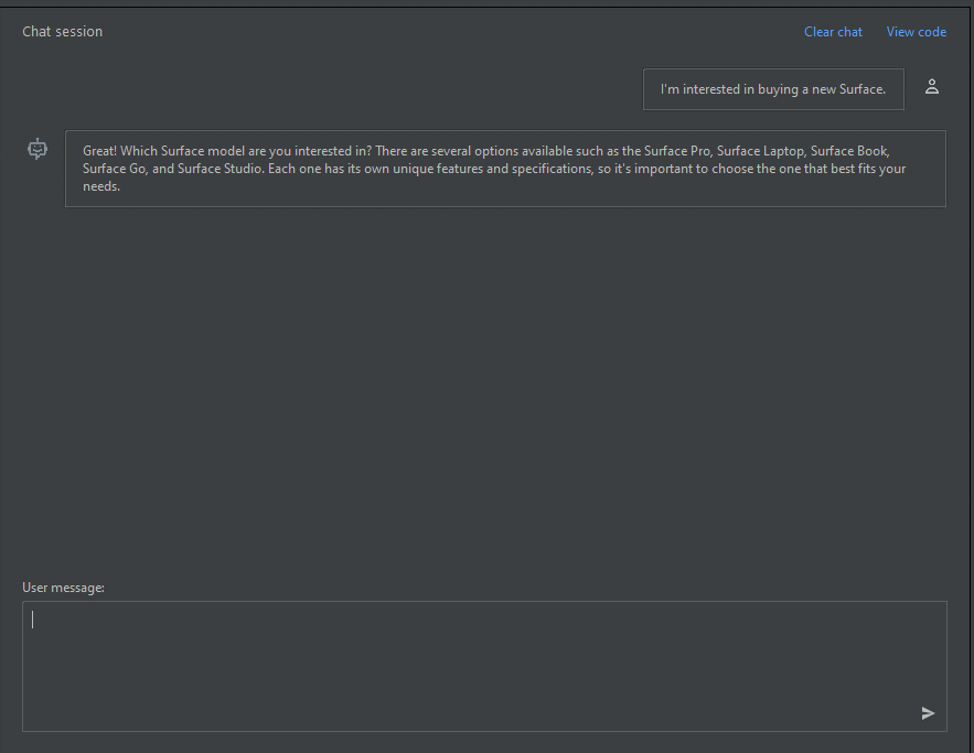 In the chat session pane, you can start with a simple prompt like this one: "I'm interested in buying a new Surface." After you type the prompt, select Send. You receive a response similar to the following example: