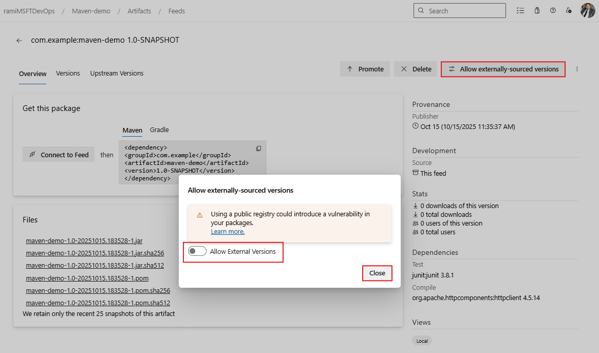Once the Allow External Versions toggle is enabled for a specific package, versions from the public registry become available to be saved to the feed. By default, this option is disabled, adding an extra layer of security by reducing exposure to potentially malicious packages from public registries. Changing this setting does not affect package versions already saved to the feed. Those versions remain accessible regardless of this setting. You must be a Feed Owner to enable the allow externally sourced versions feature.