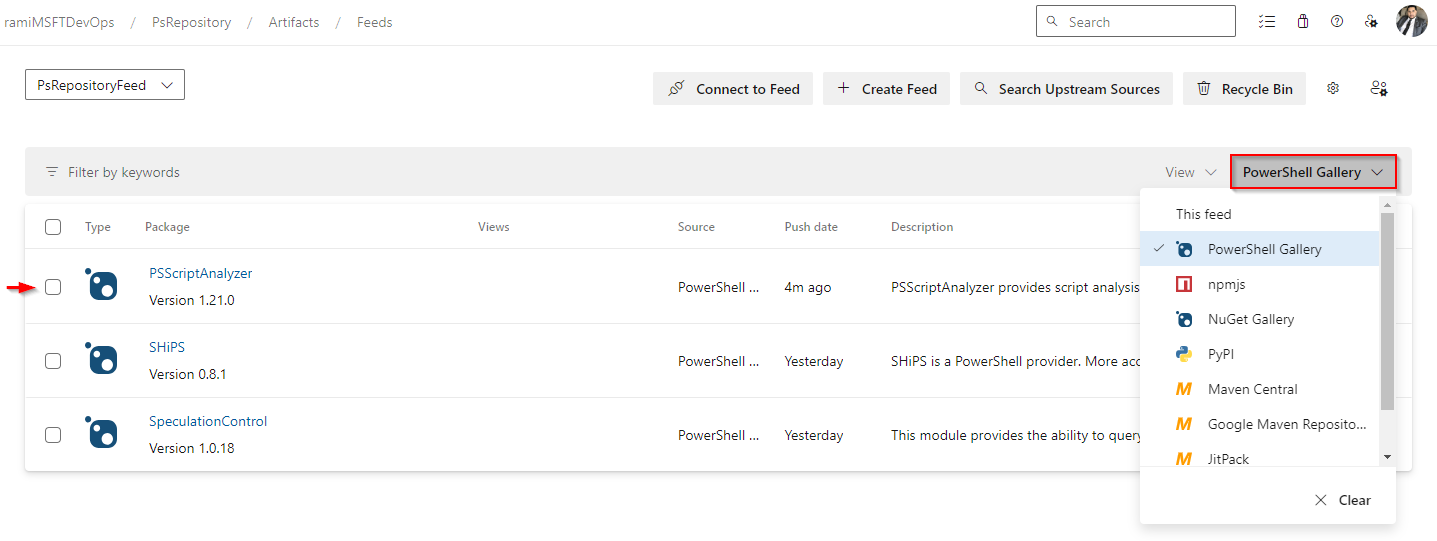 Select Source on the right, and then select PowerShell Gallery to filter for packages saved from upstream. You can see that the PSScriptAnalyzer package, which we installed in the previous step, has been saved to our feed.