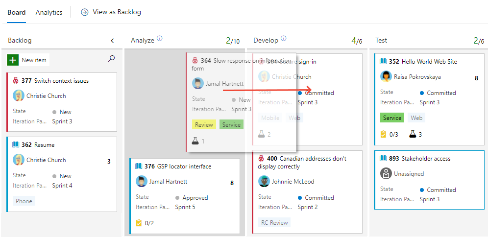 Bugs tracked as requirements — Use the board. For more information, see Update work item status.