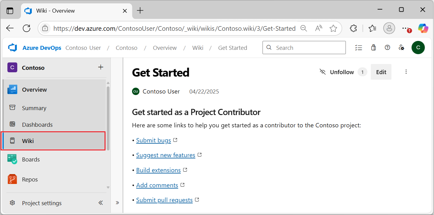 Connect to your project by using a supported web browser and select Wiki: