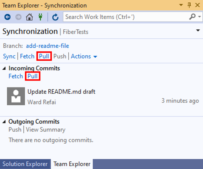 In the Git Changes window, you can keep your local branch current with its remote counterpart by using the Fetch, Pull, Push, and Sync buttons.