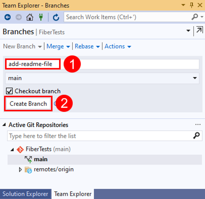 In the Create a new branch window, enter a descriptive branch name to let others know what work the branch contains. By default, Visual Studio creates your new branch from the current branch. The Checkout branch checkbox automatically switches you to the newly created branch. Select Create.