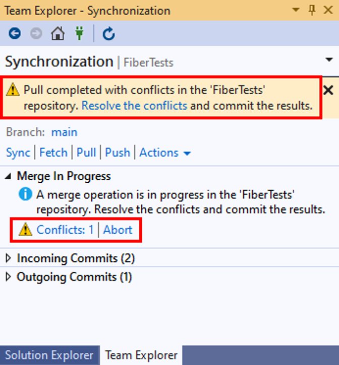 If the merge is halted due to merge conflicts, Visual Studio will notify you. You can either resolve the conflicts, or cancel the merge and return to the pre-merge state.