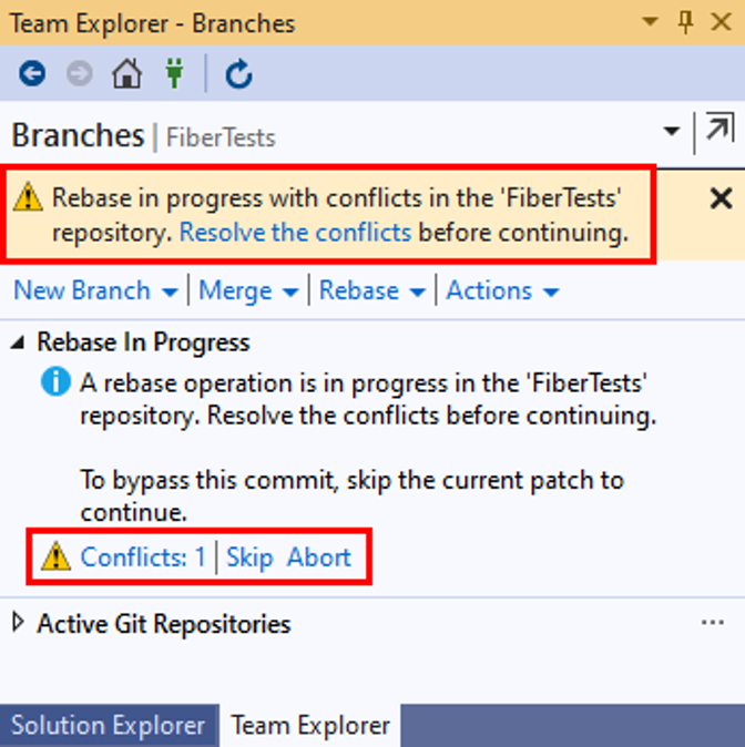 If the rebase is halted due to merge conflicts, Visual Studio will notify you. You can either resolve the conflicts, or cancel the rebase and return to the pre-rebase state.