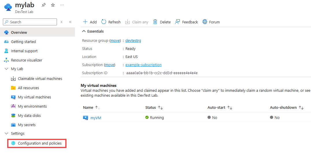 On your lab Overview page, select Configuration and policies under Settings in the left navigation.