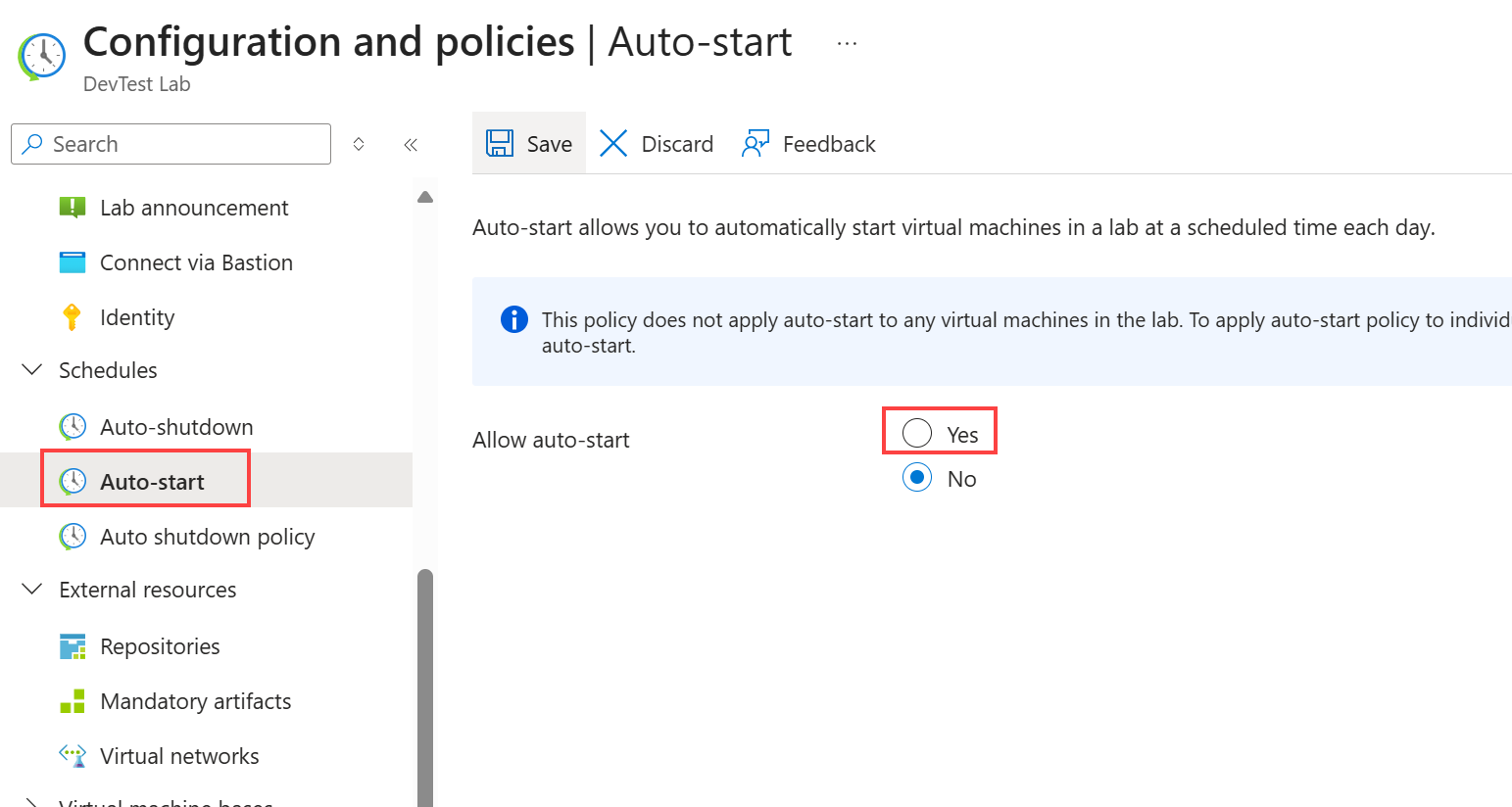 To configure an autostart policy for a lab, complete these steps. After you configure the policy, enable autostart for each VM that you want to start automatically.