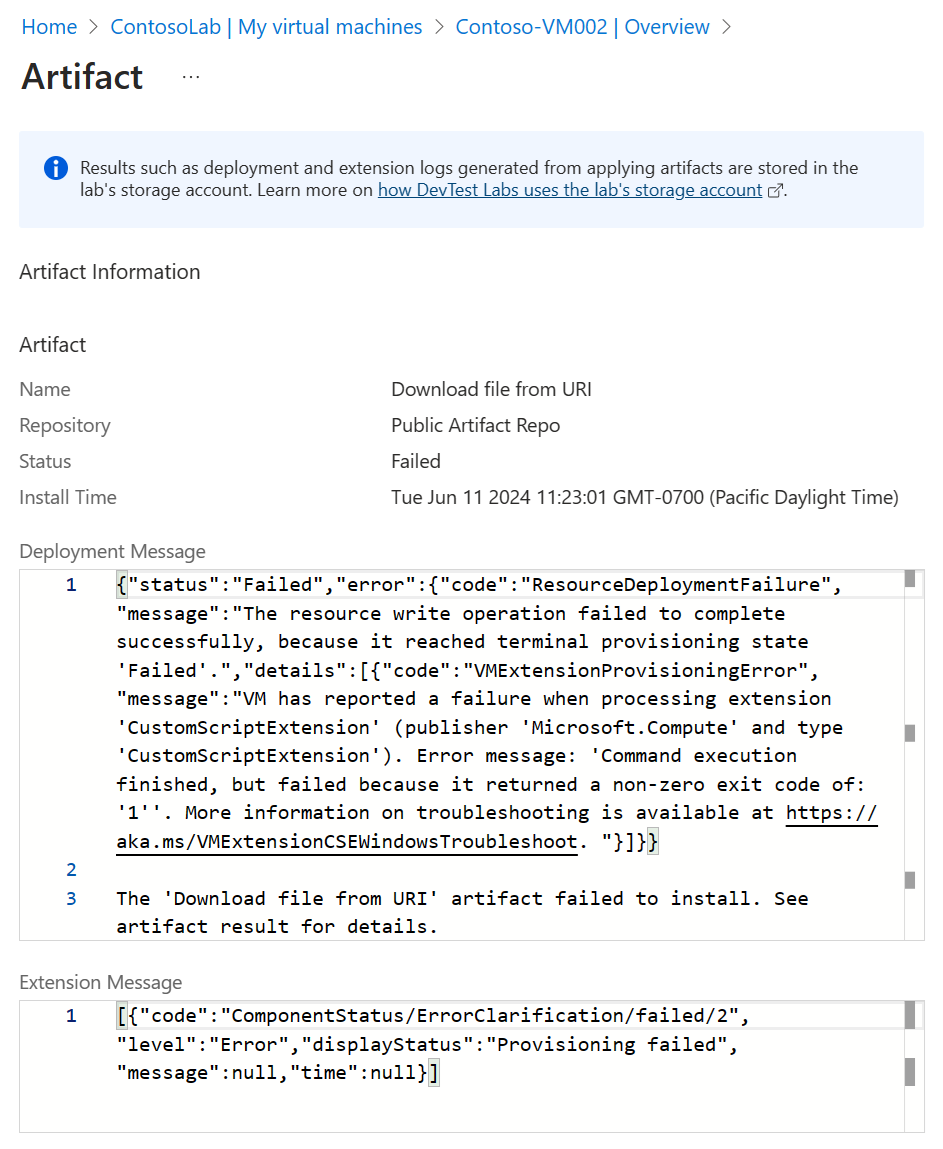 If you're trying to apply the artifact directly to your lab VM, look for failure errors related to the Create or Update Virtual Machine Extension installation process.
